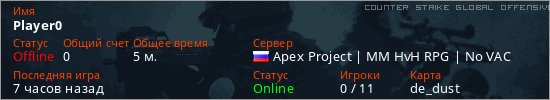 Играет на Counter Strike Global Offensive сервере. Страна: РоссияПервый раз замечен 03:07 17.04.2026