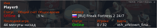 Играет на Team Fortress 2 сервере. Страна: РоссияПервый раз замечен 21:26 07.03.2026