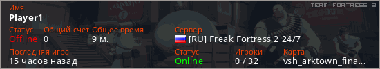 Играет на Team Fortress 2 сервере. Страна: РоссияПервый раз замечен 15:13 09.03.2026