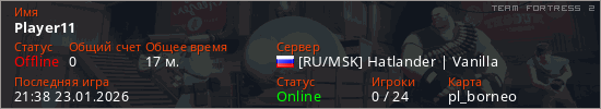 Играет на Team Fortress 2 сервере. Страна: РоссияПервый раз замечен 20:14 17.01.2026