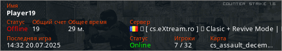 Играет на Counter Strike 1.6 сервере. Страна: РумынияПервый раз замечен 13:53 30.05.2025