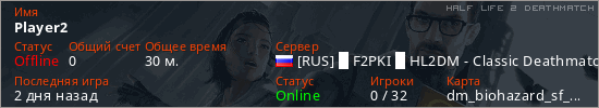 Играет на Half Life 2 DeathMatch сервере. Страна: РоссияПервый раз замечен 12:04 13.10.2025