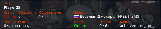 Играет на Team Fortress 2 сервере. Страна: РоссияПервый раз замечен 22:17 07.03.2026