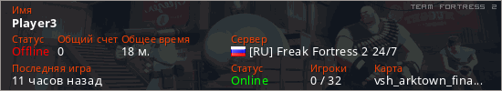 Играет на Team Fortress 2 сервере. Страна: РоссияПервый раз замечен 21:11 08.03.2026