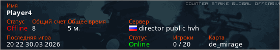 Играет на Counter Strike Global Offensive сервере. Страна: РоссияПервый раз замечен 20:20 30.03.2026