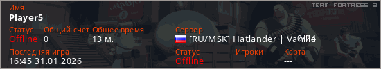 Играет на Team Fortress 2 сервере. Страна: РоссияПервый раз замечен 22:53 18.01.2026