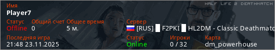 Играет на Half Life 2 DeathMatch сервере. Страна: РоссияПервый раз замечен 21:37 23.11.2025