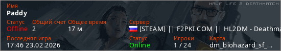 Играет на Half Life 2 DeathMatch сервере. Страна: РоссияПервый раз замечен 13:16 15.02.2026