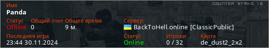 Играет на Counter Strike 1.6 сервере. Страна: УкраинаПервый раз замечен 22:05 30.11.2024