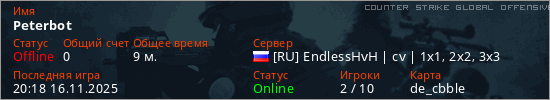 Играет на Counter Strike Global Offensive сервере. Страна: РоссияПервый раз замечен 22:49 15.11.2025
