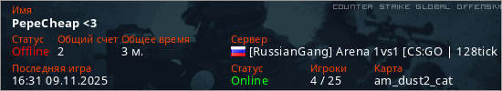 Играет на Counter Strike Global Offensive сервере. Страна: РоссияПервый раз замечен 16:31 09.11.2025