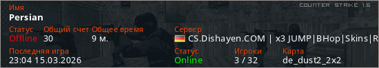 Играет на Counter Strike 1.6 сервере. Страна: ГерманияПервый раз замечен 22:47 15.03.2026