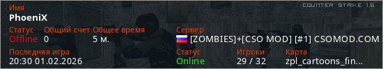 Играет на Counter Strike 1.6 сервере. Страна: РоссияПервый раз замечен 20:28 01.02.2026