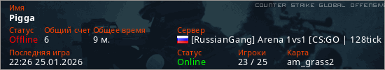Играет на Counter Strike Global Offensive сервере. Страна: РоссияПервый раз замечен 15:54 20.01.2026