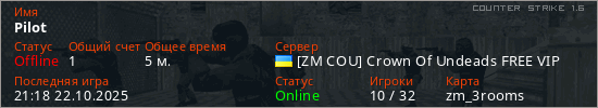 Играет на Counter Strike 1.6 сервере. Страна: УкраинаПервый раз замечен 21:16 22.10.2025