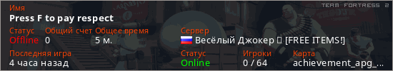 Играет на Team Fortress 2 сервере. Страна: РоссияПервый раз замечен 21:31 09.03.2026