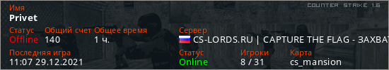 Играет на Counter Strike 1.6 сервере. Страна: РоссияПервый раз замечен 16:25 05.09.2020