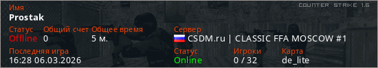 Играет на Counter Strike 1.6 сервере. Страна: РоссияПервый раз замечен 16:26 06.03.2026