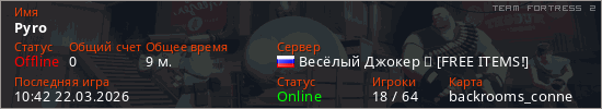 Играет на Team Fortress 2 сервере. Страна: РоссияПервый раз замечен 12:44 21.03.2026