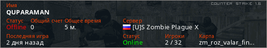 Играет на Counter Strike 1.6 сервере. Страна: РоссияПервый раз замечен 18:15 07.03.2026
