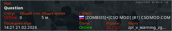 Играет на Counter Strike 1.6 сервере. Страна: РоссияПервый раз замечен 14:02 21.02.2026