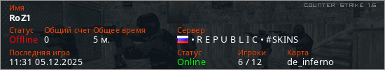 Играет на Counter Strike 1.6 сервере. Страна: РоссияПервый раз замечен 11:29 05.12.2025