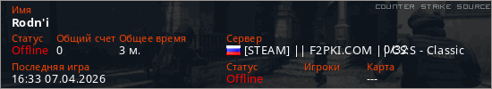 Играет на Counter Strike Source сервере. Страна: РоссияПервый раз замечен 16:33 07.04.2026