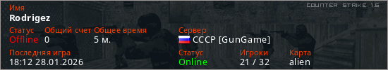 Играет на Counter Strike 1.6 сервере. Страна: РоссияПервый раз замечен 18:10 28.01.2026