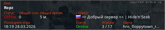 Играет на Counter Strike 1.6 сервере. Страна: РоссияПервый раз замечен 18:17 28.03.2026