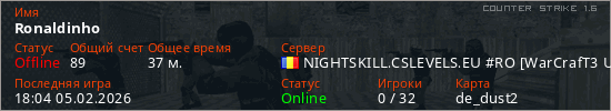 Играет на Counter Strike 1.6 сервере. Страна: РумынияПервый раз замечен 18:00 05.02.2026