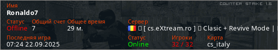 Играет на Counter Strike 1.6 сервере. Страна: РумынияПервый раз замечен 19:44 10.12.2024