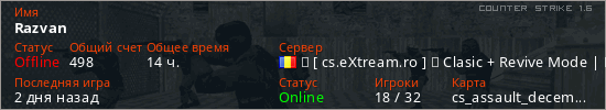 Играет на Counter Strike 1.6 сервере. Страна: РумынияПервый раз замечен 08:10 11.01.2025