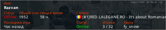 Играет на Counter Strike 1.6 сервере. Страна: РумынияПервый раз замечен 18:19 15.06.2022