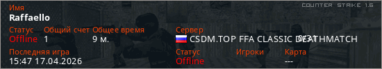 Играет на Counter Strike 1.6 сервере. Страна: РоссияПервый раз замечен 15:02 17.04.2026