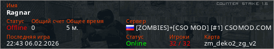 Играет на Counter Strike 1.6 сервере. Страна: РоссияПервый раз замечен 22:41 06.02.2026