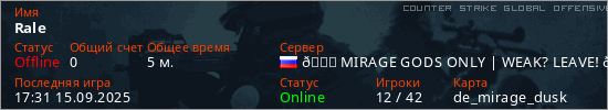 Играет на Counter Strike Global Offensive сервере. Страна: РоссияПервый раз замечен 17:27 15.09.2025