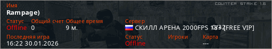 Играет на Counter Strike 1.6 сервере. Страна: РоссияПервый раз замечен 11:53 30.01.2026