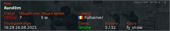 Играет на Counter Strike 1.6 сервере. Страна: РумынияПервый раз замечен 16:26 26.08.2025
