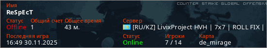 Играет на Counter Strike Global Offensive сервере. Страна: КазахстанПервый раз замечен 14:47 28.10.2025