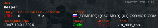 Играет на Counter Strike 1.6 сервере. Страна: РоссияПервый раз замечен 10:45 10.01.2026