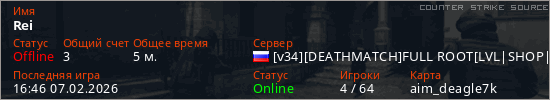 Играет на Counter Strike Source сервере. Страна: РоссияПервый раз замечен 16:37 07.02.2026