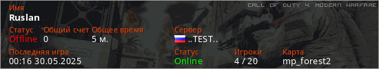 Играет на Call of Duty 4: Modern Warfare сервере. Страна: РоссияПервый раз замечен 23:56 29.05.2025
