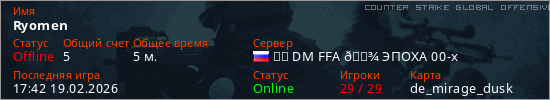 Играет на Counter Strike Global Offensive сервере. Страна: РоссияПервый раз замечен 17:36 19.02.2026