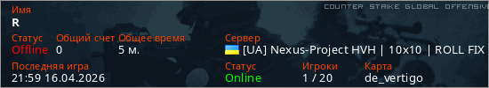 Играет на Counter Strike Global Offensive сервере. Страна: УкраинаПервый раз замечен 21:51 16.04.2026