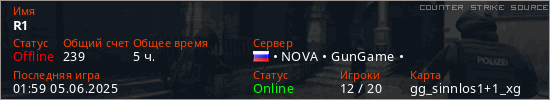 Играет на Counter Strike Source сервере. Страна: РоссияПервый раз замечен 21:36 05.01.2025