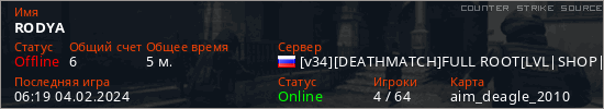 Играет на Counter Strike Source сервере. Страна: РоссияПервый раз замечен 06:15 04.02.2024