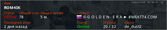 Играет на Counter Strike 1.6 сервере. Страна: РоссияПервый раз замечен 03:51 02.03.2026