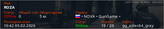 Играет на Counter Strike Source сервере. Страна: РоссияПервый раз замечен 10:31 05.02.2026