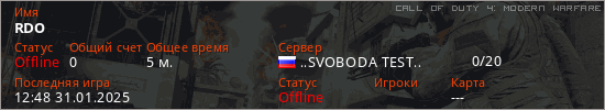 Играет на Call of Duty 4: Modern Warfare сервере. Страна: РоссияПервый раз замечен 12:46 31.01.2025
