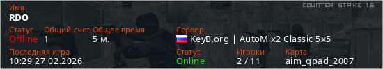Играет на Counter Strike 1.6 сервере. Страна: РоссияПервый раз замечен 10:27 27.02.2026